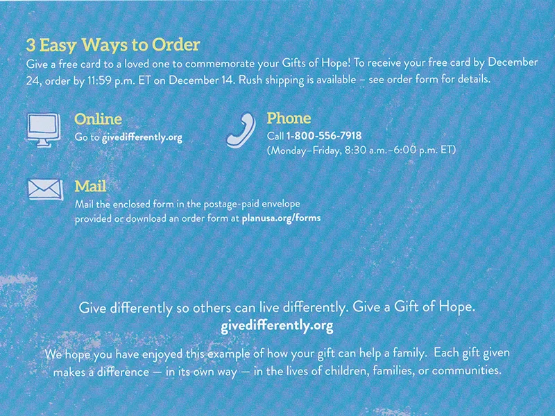 The illustrations were hand-drawn and accented with texture and a limited color palette. To help communicate that Plan International's Gifts of Hope change lives, I started the illustrations with very minimal color and added more and more color as the family's lives continued to improve. I'm thankful for the opportunity to create work for organizations making a difference in the world; for more information visit Plan International's website.