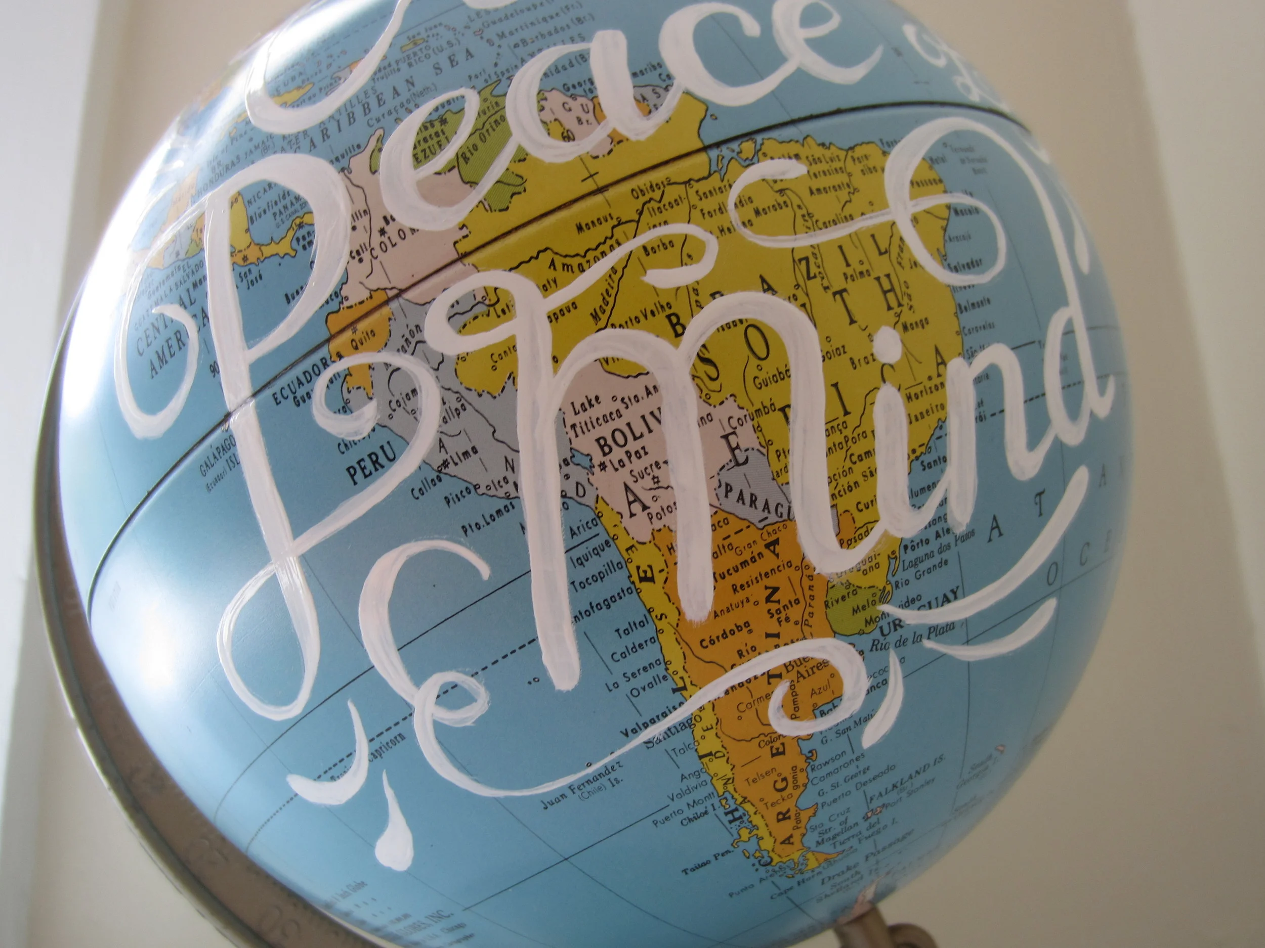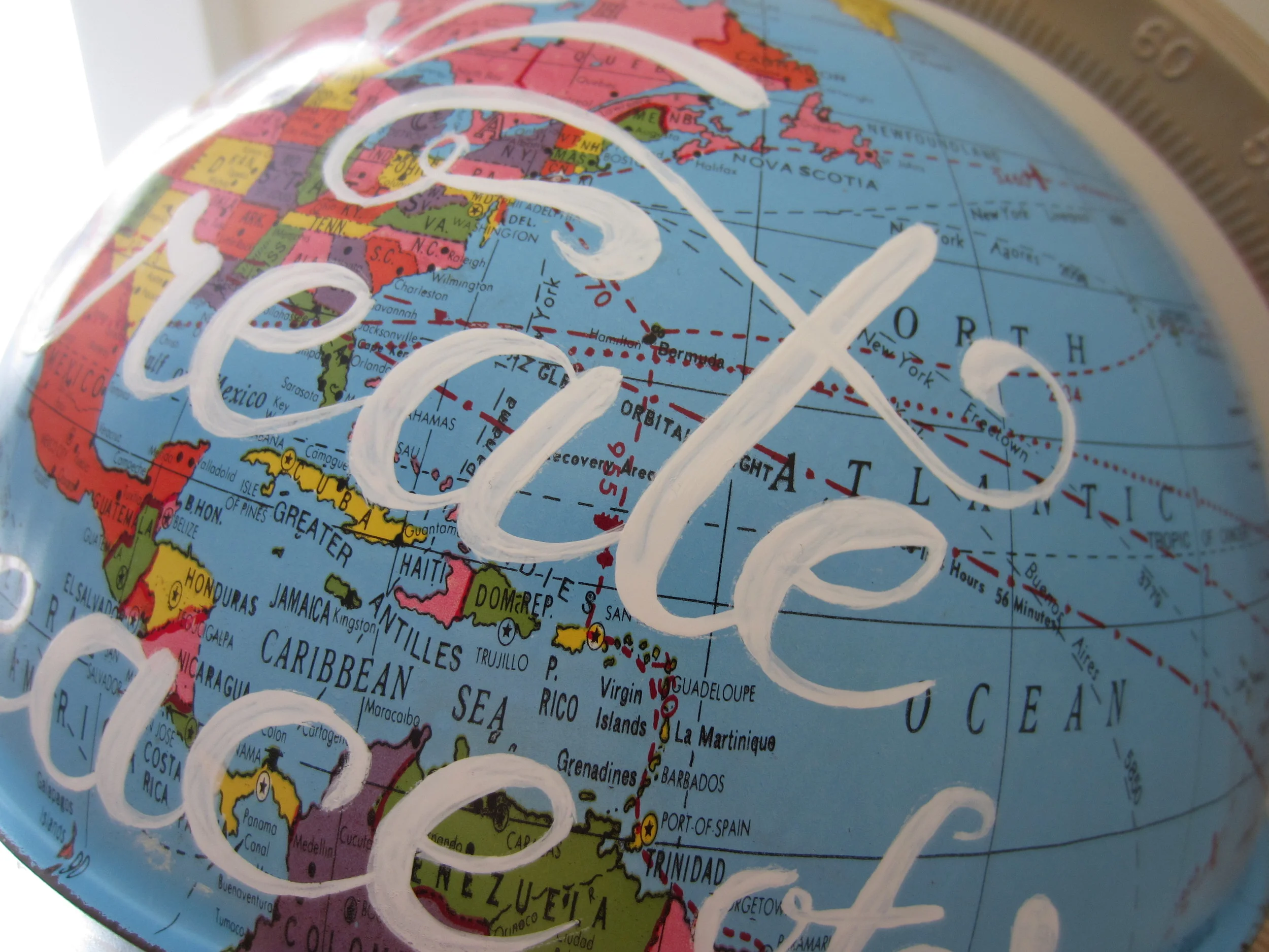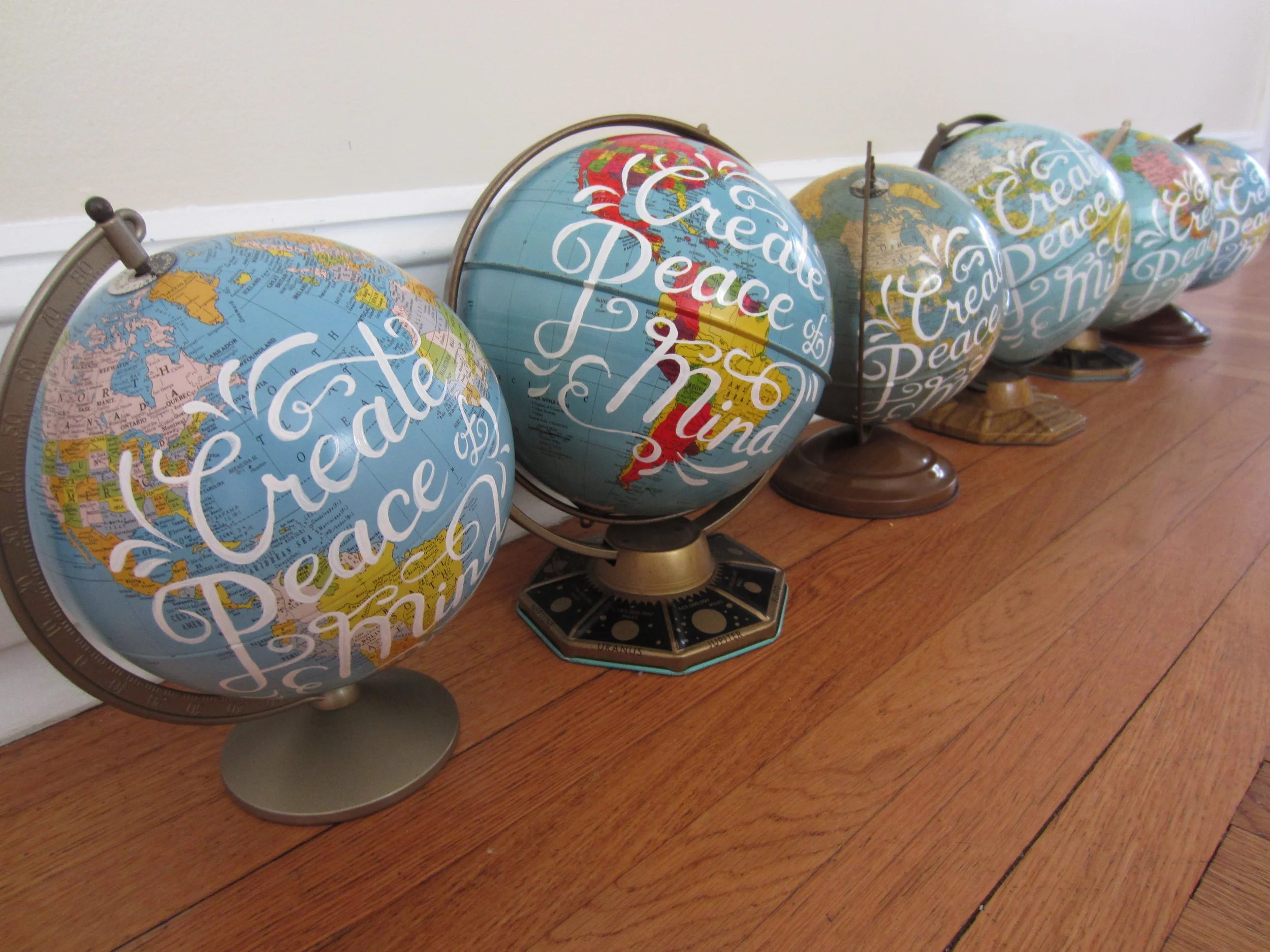 I was recently commissioned to hand-paint a collection of vintage globes for PeaceLove's annual "Peace of Mind" awards. The awards were given to different organizations and individuals who are helping to change how people think about mental health. Painting the lettering on each globe was a treat, and I'm thankful to be working with such an amazing company.