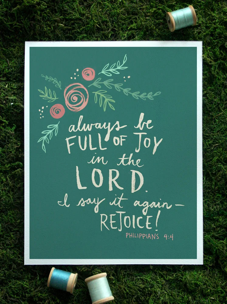 This print features hand-lettering of Philippians 4:4 ("Always be full of joy in the Lord. I say it again – rejoice!") and simple floral illustrations. The deep green background with a very subtle texture puts all the emphasis on the pale peach lettering. This print looks stunning in a white frame with a white mat, especially against a wall painted in a coordinating color.